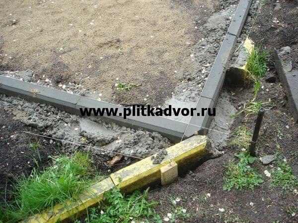 - Установка искусственного камня. Получившийся цементный раствор заливается на поверхность основания и сразу за ним погружаются бордюры. Они подгоняются по натянутой нитке с помощью постукиваний резинового молотка.